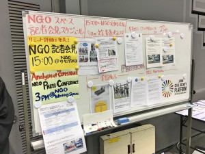 - G7サミットでは通例、様々なNGOもIMCに入りメディアワークをしますが、今回は「NGOワーキングスペース」という場所がIMCの隣のフットサル施設内に設置され、外務省が発行する専用パスを有したNGO関係者約100名が同スペースで活動しました。2016年G7サミット市民社会プラットフォームは、毎日14時に定例記者会見を開催し、初日は動く→動かす代表を務める今田代表理事が登壇しました。